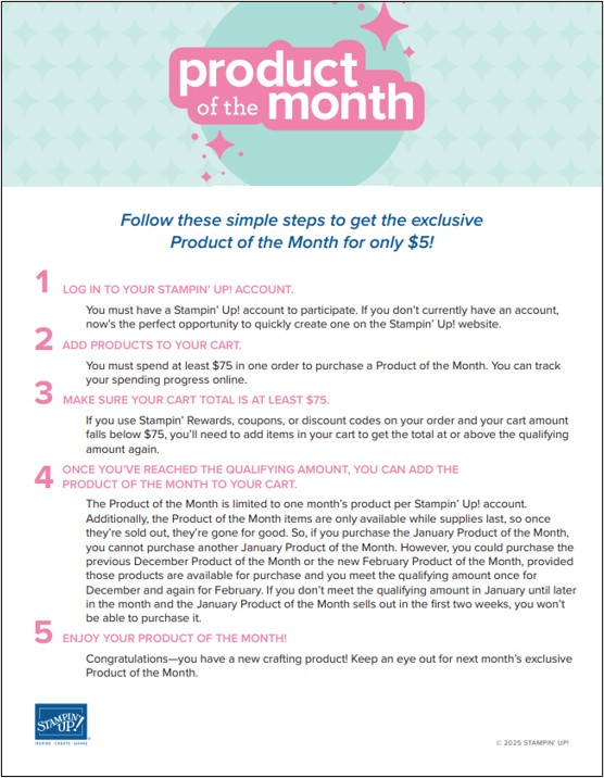 - Every month, Stampin’ Up! will release an exclusive item available for just $5 with a minimum $75 order placed through your online account.